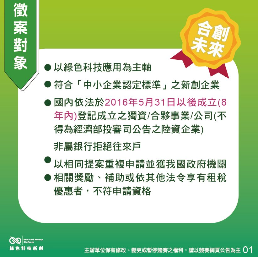經濟部中小及新創企業署為協助綠色科技新創發展,依「經濟部協