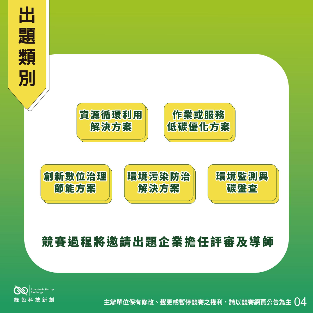 題,新創解題,出題方向以 #綠色科技、#淨零碳排 等與 #綠色科技 相關議題為主。邀請新創企業一展身手!